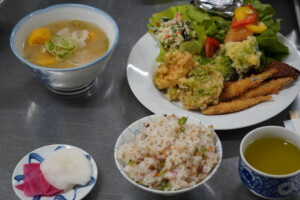 Dクラスのメニューは、まぜご飯、かぼちゃ団子のつみれ汁、揚げ物、潮豆腐の白あえ、手羽先の甘酢煮。