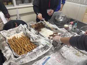メニューはこれまでと同じく、まぜご飯、かぼちゃ団子のつみれ汁、揚げ物、潮豆腐の白あえ、手羽先の甘酢煮を作りました。