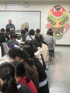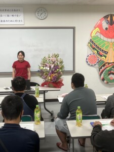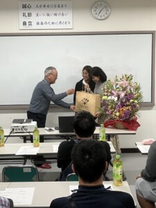 地元、坂の上町内会の皆様に学校の寮で、歓迎会を開いていただきました。会長さんのお祝いの言葉に続き、入学記念品をいただきました。新入生からは次のように、お礼の言葉を述べました。「私は日本に来る前、五島での生活について心配していました。日本語は大丈夫かな? 五島の人は優しいかな? しかし、今日、町内会の皆様の温かい歓迎を受けて、とてもホッとしました。私たちは2年間、ここで安心して勉強することができると思いました。これから坂の上町内会の皆様と交流できることを楽しみにしています。今日は、私たちのために、このような会を開いていただき、ありがとうございました。」